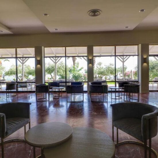 Το ξενοδοχείο διαθέτει 185 ευρύχωρα δωμάτια τα οποία αποπνέουν πρωτοφανή άνεση. Όλοι οι τύποι δωματίων διαθέτουν ιδιωτικό μπαλκόνι που προσφέρουν είτε εκπληκτική θέα προς το Αιγαίο Πέλαγος είτε θέα στα γύρω ορεινά τοπία του θέρετρου.